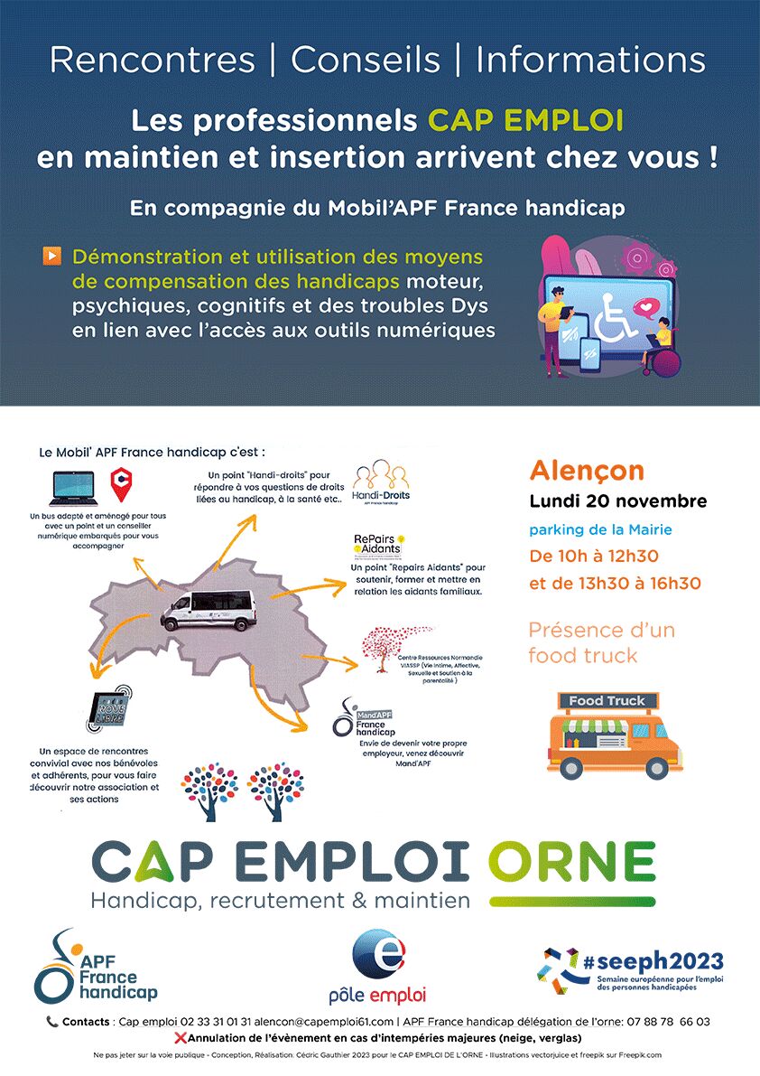 Rencontres | Conseils | Informations Les professionnels CAP EMPLOI en maintien et insertion arrivent chez vous ! En compagnie du Mobil’APF France handicap
